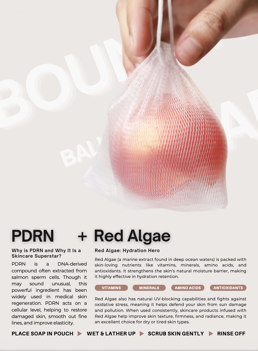 Deze bouncy ball soap zit boordevol actieve werkstoffen die verder gaan dan alleen reinigen. PDRN zorgt voor diepgaand huidherstel, terwijl Rode Algen intens hydrateren, beschermen en de huid zichtbaar doen stralen.